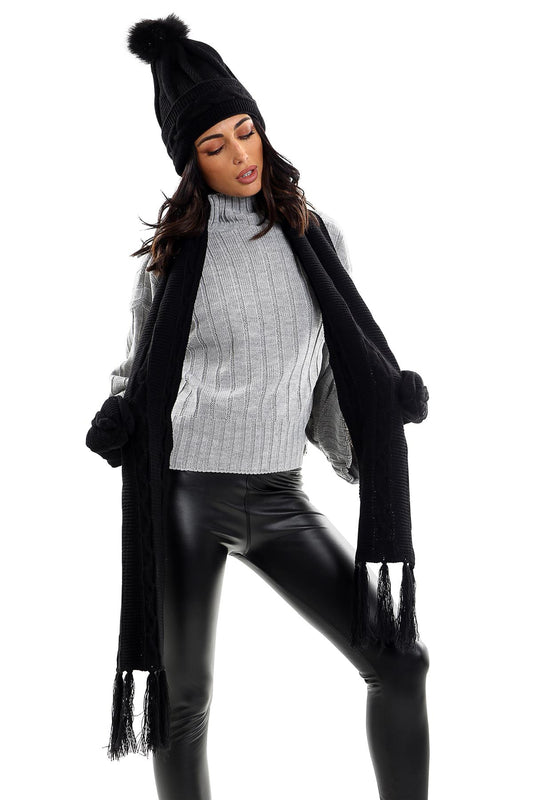Ladies LHTSF171 Wooly Thick Knitted Hat Scarf & Mitten Set - BLACK