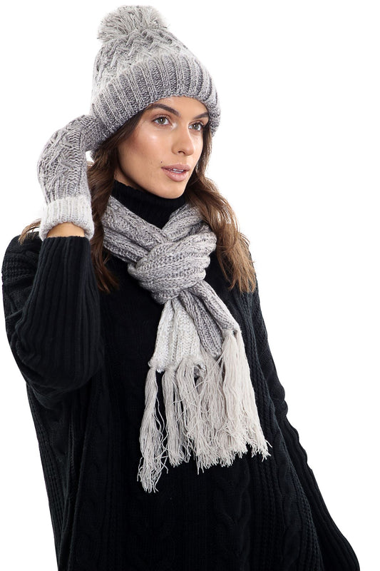 Womens LHTSF172 Wooly Thick knitted Hat, Scarf and Glove set - Grey & White