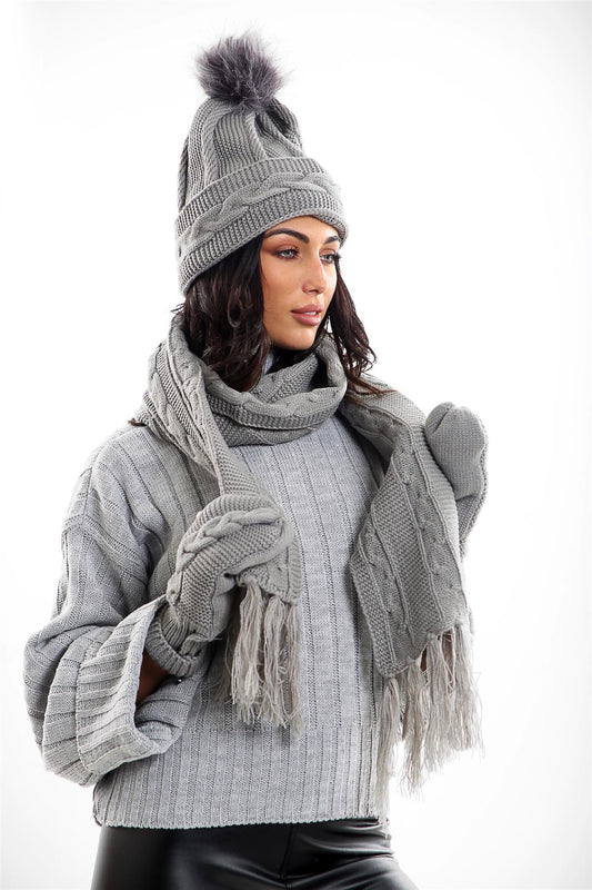 Ladies LHTSF171 Wooly Thick Knitted Hat Scarf & Mitten Set - GREY