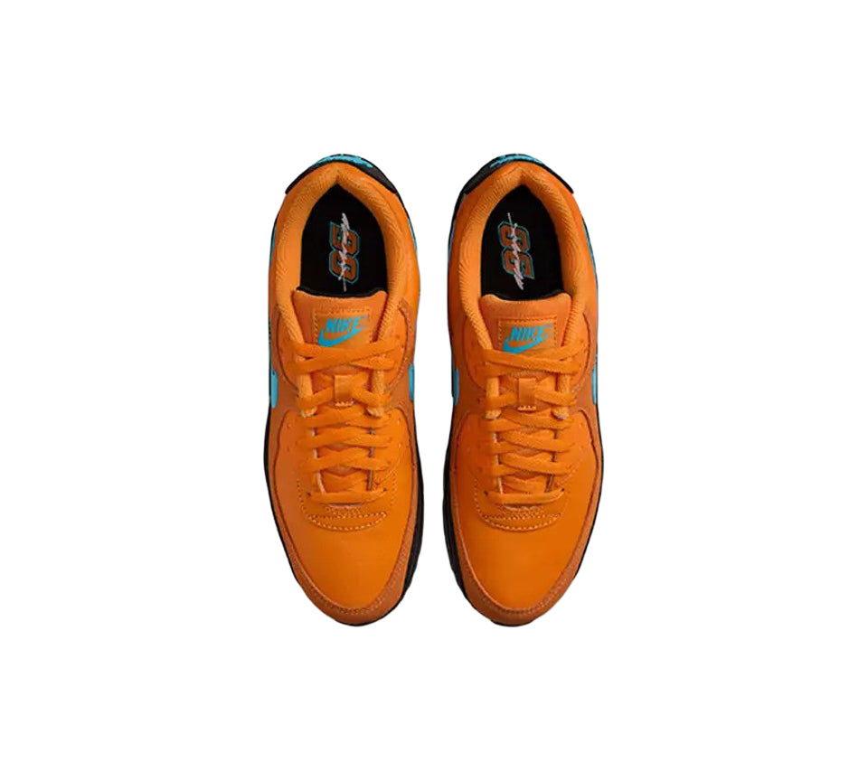 The sneaker’s standout feature is its dominant “Mandarin” orange upper, crafted from a blend of perforated leather and mesh to provide dynamic texture and enhanced breathability. Accents of “Blue Fury” on the lace eyelets, heel tab and Swoosh logo deliver a vibrant contrast, amplifying the shoe’s high-energy aesthetic. A jet-black mudguard and outsole anchor the design, offering visual balance and reinforcing the racing-inspired theme. Completing the look, a gradient-shaded “90” emblem and cursive script branding on the interior tie this release cohesively to the rest of the pack.